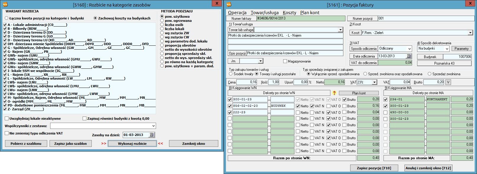 Moduł umożliwia pełną ewidencję dokumentów zakupu i sprzedaży zgodnie z Ustawą o podatku od towarów i usług, ich szybkie wyszukiwanie i automatyczne księgowanie w systemie finansowo-księgowym. Ponadto umożliwia, już na etapie wprowadzania dokumentów, automatyczne rozksięgowywanie kosztów z faktur na budynki, osiedla i lokale wg rodzajów zasobów oraz różnych kluczy i stawek VAT.